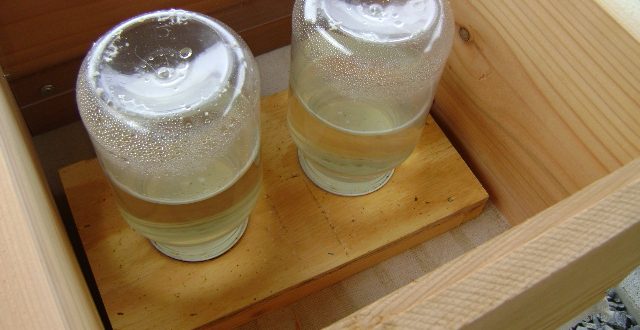 وتوضع الغذاية مقلوبة فوق قمة الأقراص مع وضع شريحتين من الخشب أسفلها حتى تتمكن الشغالات من سحب المحلول السكري وحتي تكون هناك مسافة بين الغذاية وقمة الأقراص تسمح للشغالات بالتغذية.